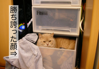 そにゃのにゃ。 ここはとってもキモチいいのにゃ。 でも前に閉じ込められたことがあるのにゃ。 あの時はしばらく気付かれにゃくて大変だったんだにゃ(>〜<)ある意味かくれんぼだったのにゃ。 |